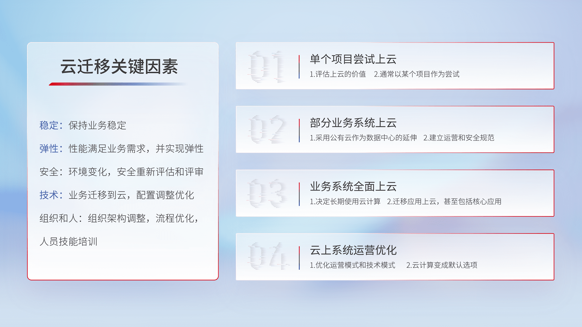 结合实际业务,,,从规划设计、、云平台选型、、、云原生改造、、数据迁移、、集成交付,,迁移全过程为客户识别最佳上云路径,,做好风险识别管理,,设计网络架构、、、、身份权限、、、安全审计合规、、、、操作审计、、、、日志审计、、监控告警策略、、、多站点容灾设计等,,,,对云上基础设施进行整体规划,,,提升IT治理水平,,,,以满足弹性、、高可用、、、高性能的需求。。。。