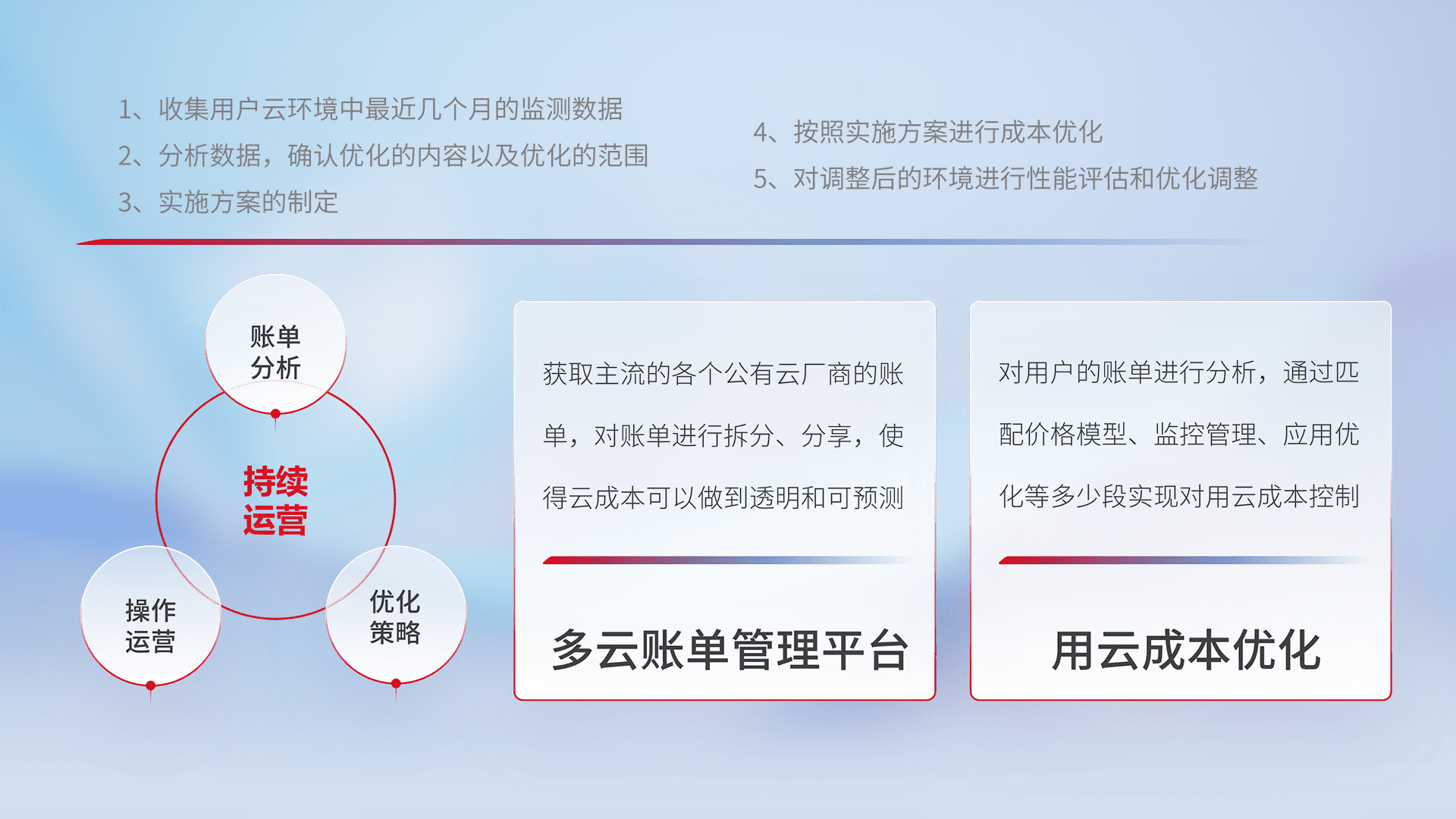 监控业务系统资源开销,,,,对资源的消耗精确计量,,,,实现费用的透明化管理,,不断提升资源使用率,,,,调整资源购买方式,,,降低资源费用成本,,,用云成本可预测、、用云费用可优化,,云资源配额有据可依。。